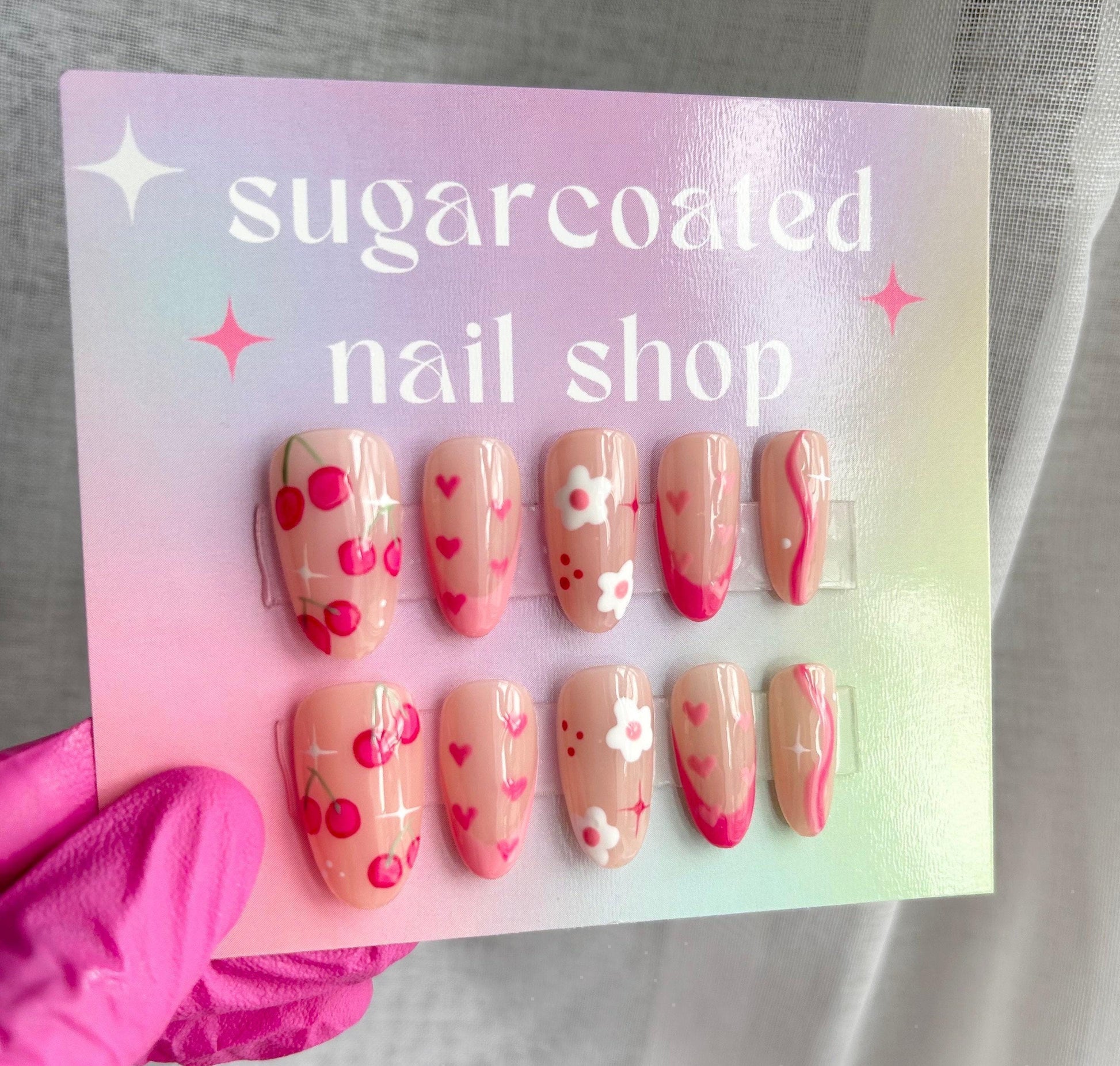 Each set is handcrafted, hand-painted, and made from scratch by the seller at Sugarcoated Nail Shop. Your order is uniquely tailored to your preferences and sizing. The images show a finished customized item similar to the product you will receive. The pictures represent the art inspiration for your set. Since all sets are made to order and unique to your custom specifications, the product you receive will not be exact to the inspiration photo — this is simply to help you visualize the final look of your custom set.